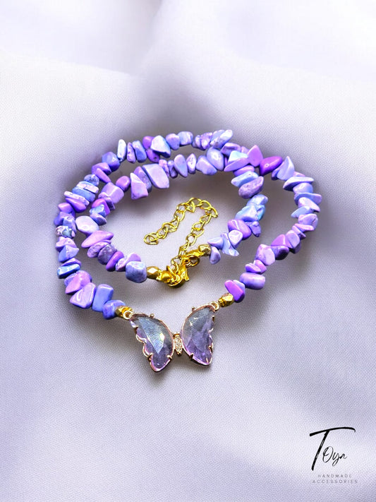 Broken Sea Shell with Purple Crystal Butter Fly Charm Necklace for Women