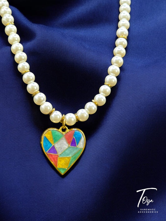 White Pearl with Mosaic Style Colorful Resin Heart Shape Pendant Necklace for Women and Girls