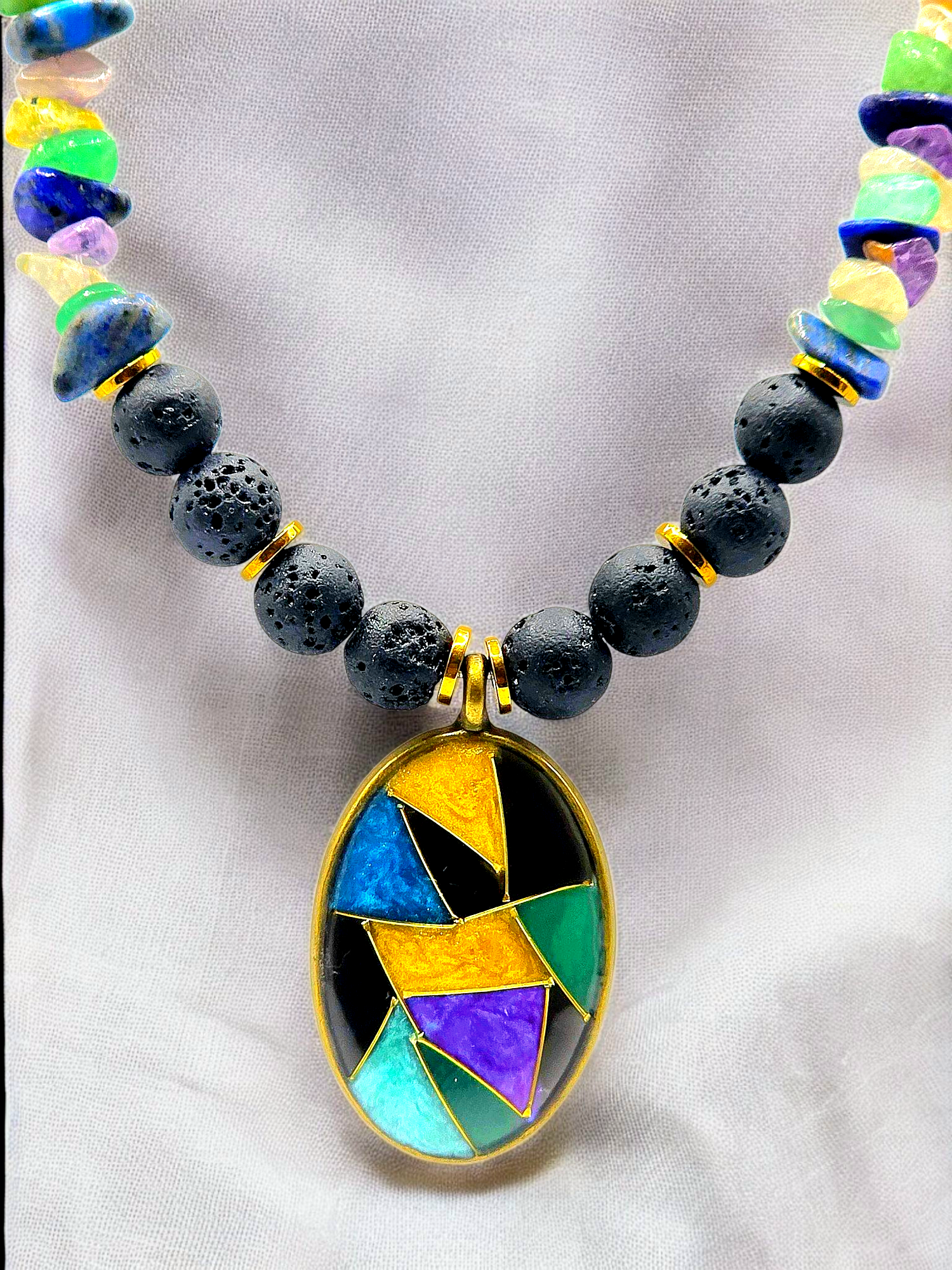 Exclusive New Design Classic Black Lava with Colorful Broken Dea Shell Beads and Golden Hematite Separators complemented with Colorful Mosaic Pendant Necklace for Women