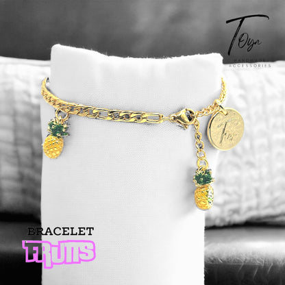 Enhance your style with our Gold Plated Hand Bracelet featuring a cheerful and shiny Fruits Charms. The adjustable size of 16+5 cm makes it suitable for all outfits and occasions. Upgrade your accessory game with this new design.